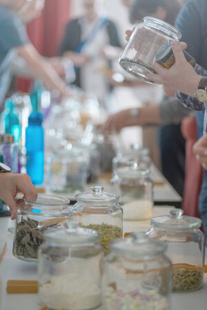 Nach einem einleitenden Redebeitrag durch mich zu den spannenden Besonderheiten dieses unterschätzten Sinnessystems hatten die TeilnehmerInnen die Möglichkeit sich durch eine Vielzahl von bereitgestellten Duftkompositionen zu riechen. Mit Hilfe von duftenden Materialien aus meiner alltäglichen Duftumwelt habe ich olfaktorische Erinnerungen und persönliche Dufterlebnisse nachgebaut und so zu einem intimen Einblick in meine geruchliche Vergangenheit eingeladen. In einem olfaktorischen Tagebuch habe ich den Duft meiner Mutter, den letzten Sommerurlaub oder das Schuhgeschäft meiner Kindheit zum Leben erweckt. Im anschließenden Workshop konnten die BesucherInnen sich an einer breit aufgestellten „Duftbar“ bedienen und selbst Dufterinnerungen oder individuelle Duftkompositionen erstellen.
